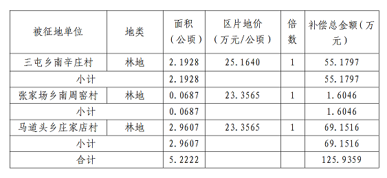 三屯乡南辛庄村:林地2.1928公顷。张家场乡南周窑村:林地0.0687公顷。马道头乡庄家店村:林地2.9607公顷。