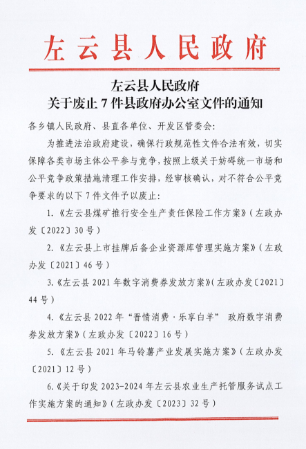 左云县人民政府关于废止7件县政府办公室文件的通知