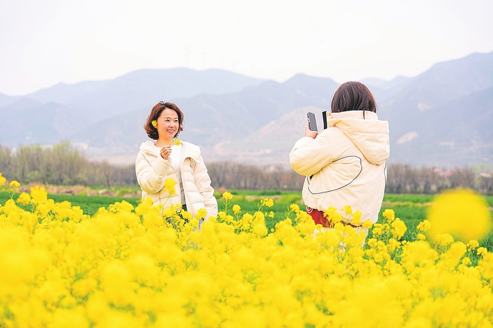 游客在运城盐湖区西姚村盛开的油菜花田里游玩拍照。