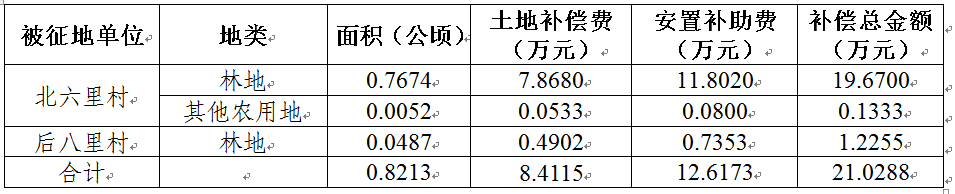 3、拟用地面积:用地总面积0.8213公顷,全部为农用地(林地0.8161公顷,其他农用地0.0052公顷);按权属分:集体土地0.8213公顷,不涉及国有土地。